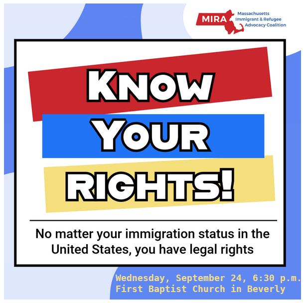 Join us for Know Your Rights’ training on how to handle interactions with immigration enforcement agents, at 6:30 p.m. (with dessert and refreshments!).