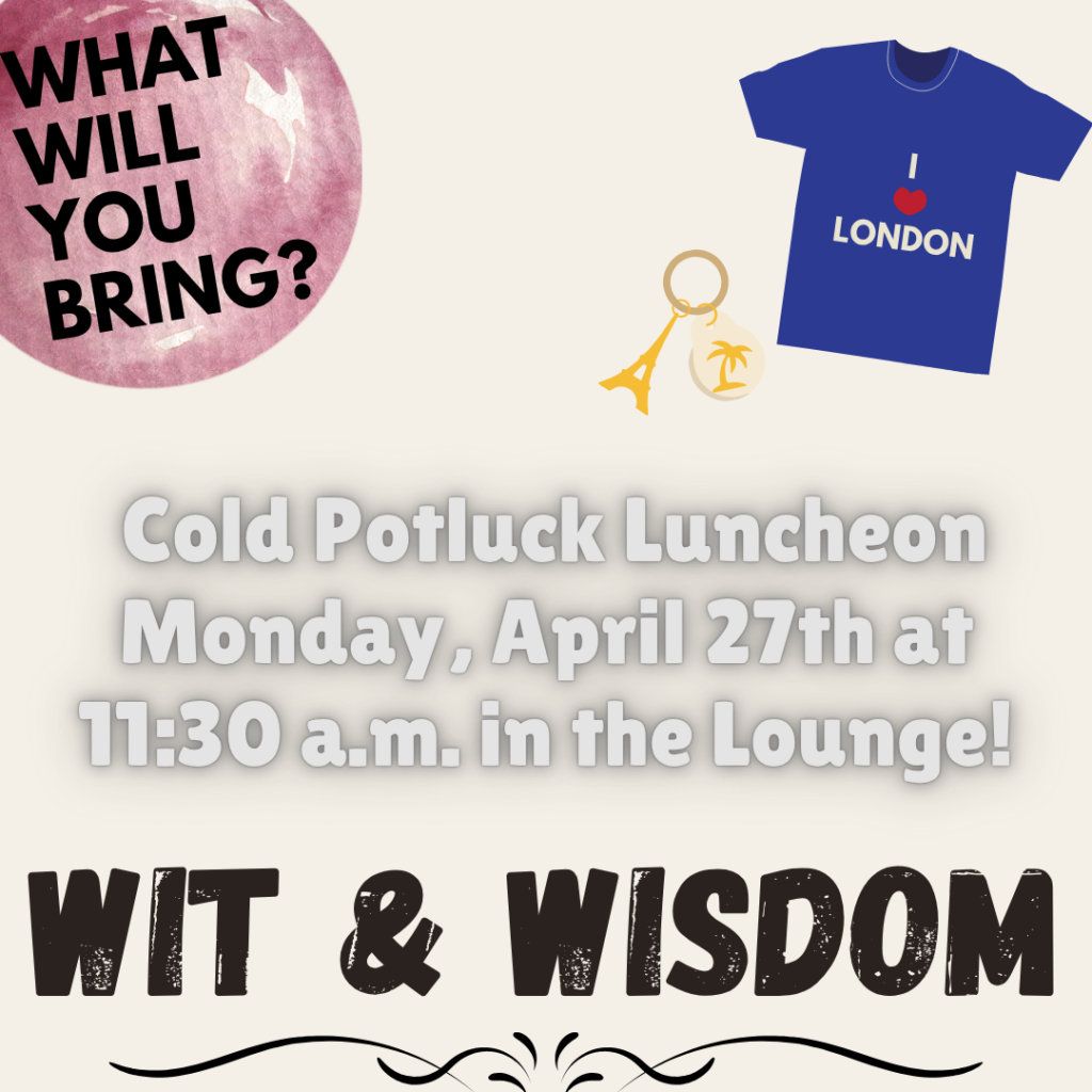 The Wit and Wisdom group will hold its next luncheon meeting on Monday, April 27 at 11:30 a.m. in the FBC lounge. All interested adults of retirement age are invited! Please join us!